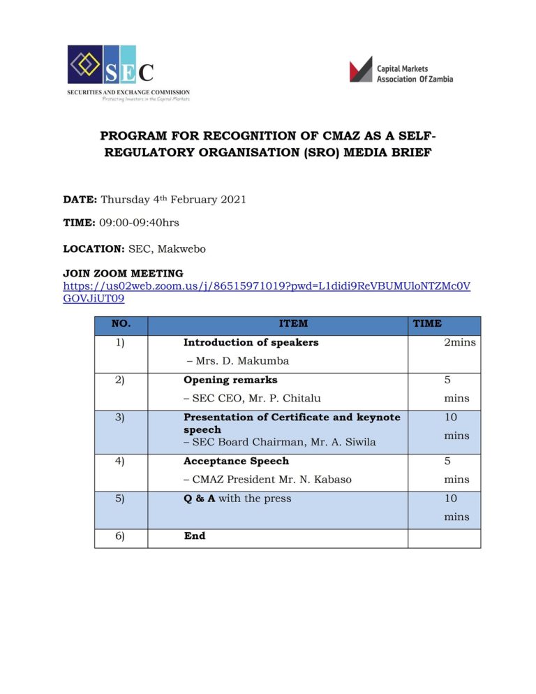 Program for Recognition of CMAZ As A Self-Regulatory Organisation (SRO) Media Brief