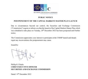 Public Notice – Postponement of The Capital Markets Master Plan Launch