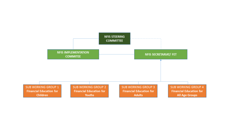 The National Financial Inclusion Strategy (NFIS) Steering Committee provides overall policy guidance for the implementation of the NSFE. Implementation of the NSFE activities are undertaken through the four Sub-Working Groups on: i) Financial Education for Children, ii) Financial Education for Youths, iii) Financial Education for Adults, and iv) Financial Education for All Age Groups. The Sub-Working Groups report to the NFIS secretariat/FET