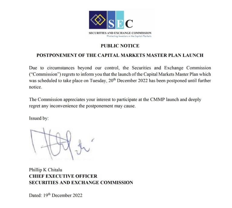 Public Notice – Postponement of The Capital Markets Master Plan Launch