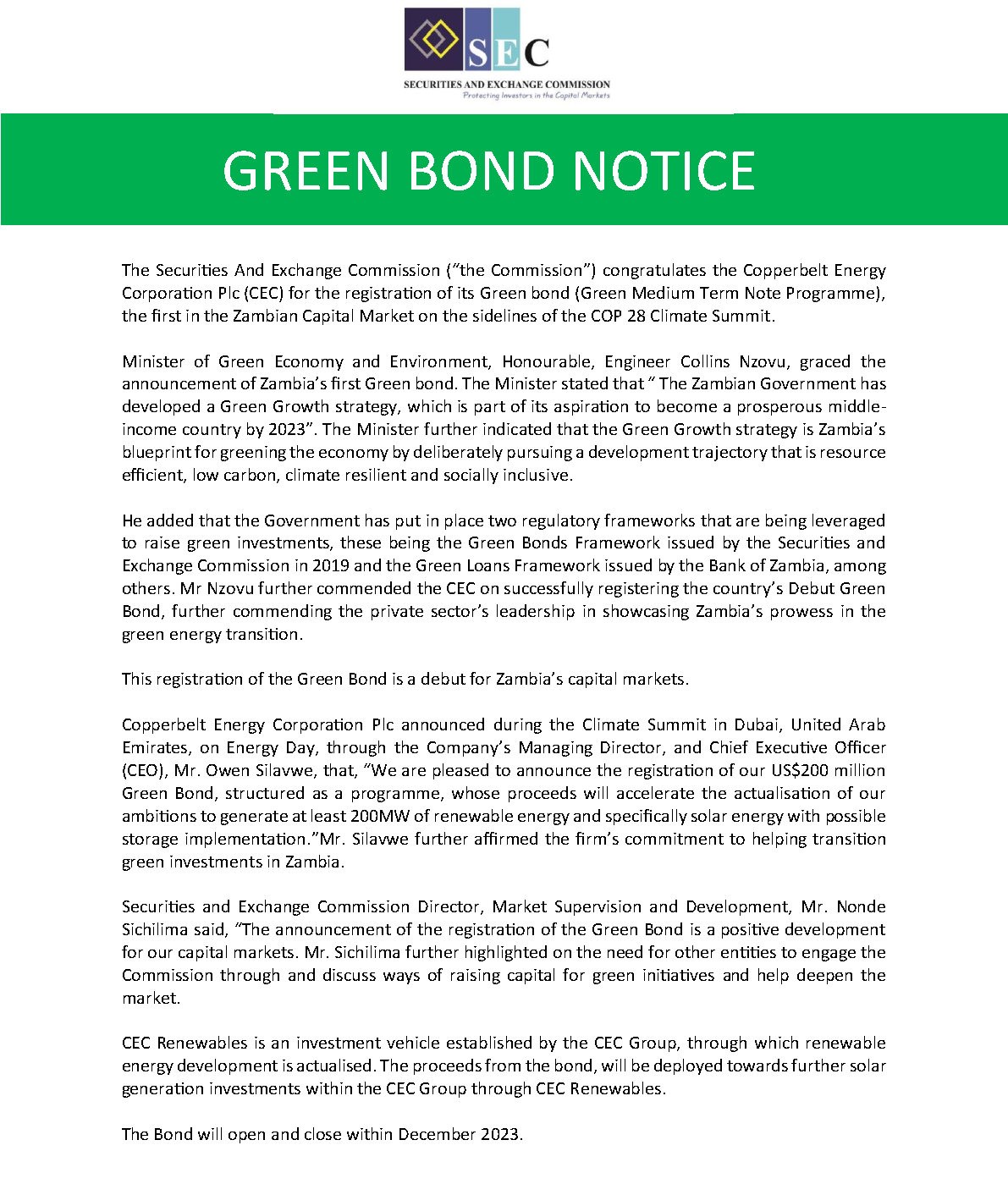 The Securities And Exchange Commission (“the Commission”) congratulates the Copperbelt Energy Corporation Plc (CEC) for the registration of its Green