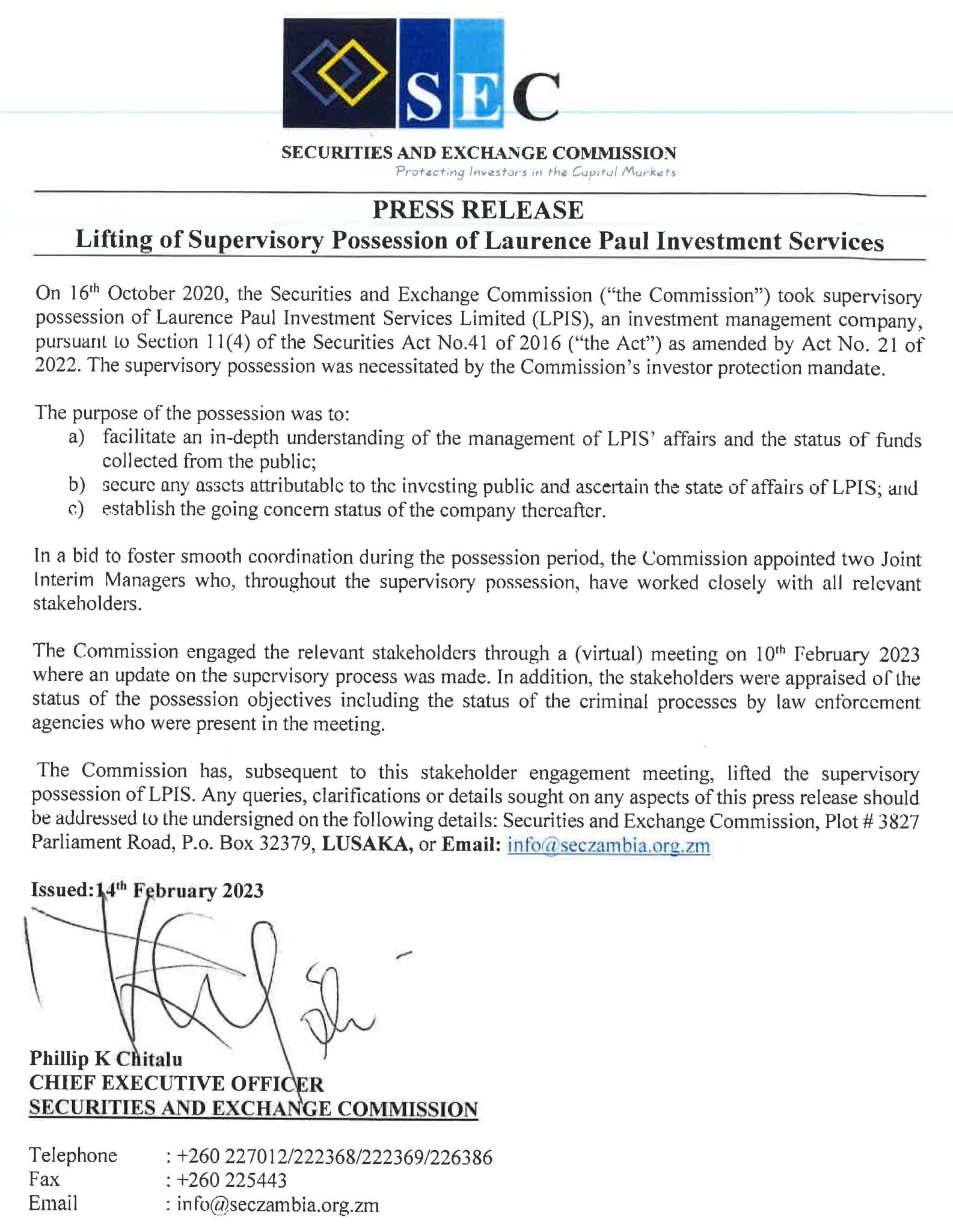 On 16th October 2020, the Securities and Exchange Commission (“the Commission”) took supervisory possession of Laurence Paul Investment Services Limited
